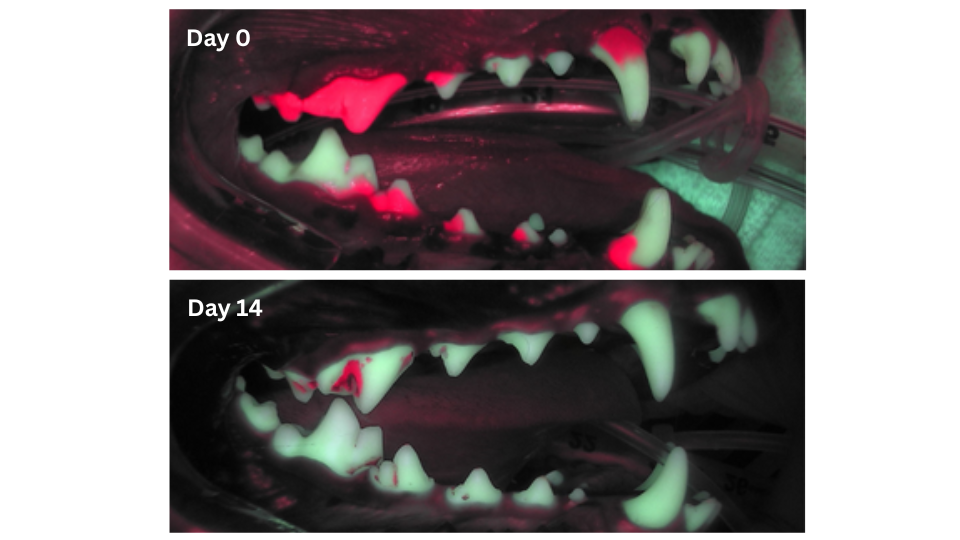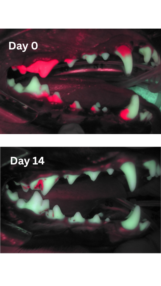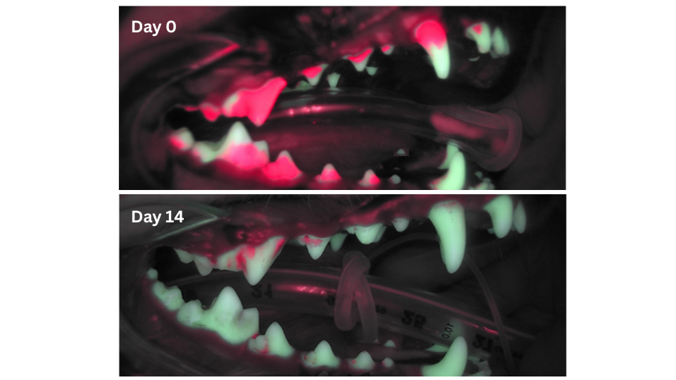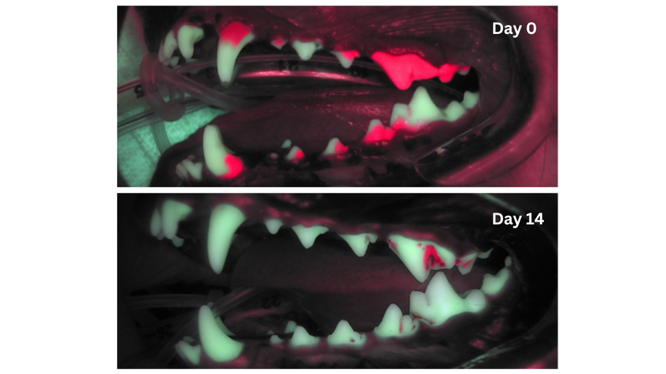 In the clinical study, veterinarians used a blue light that highlights the bacteria that causes bad breath and plaque.
