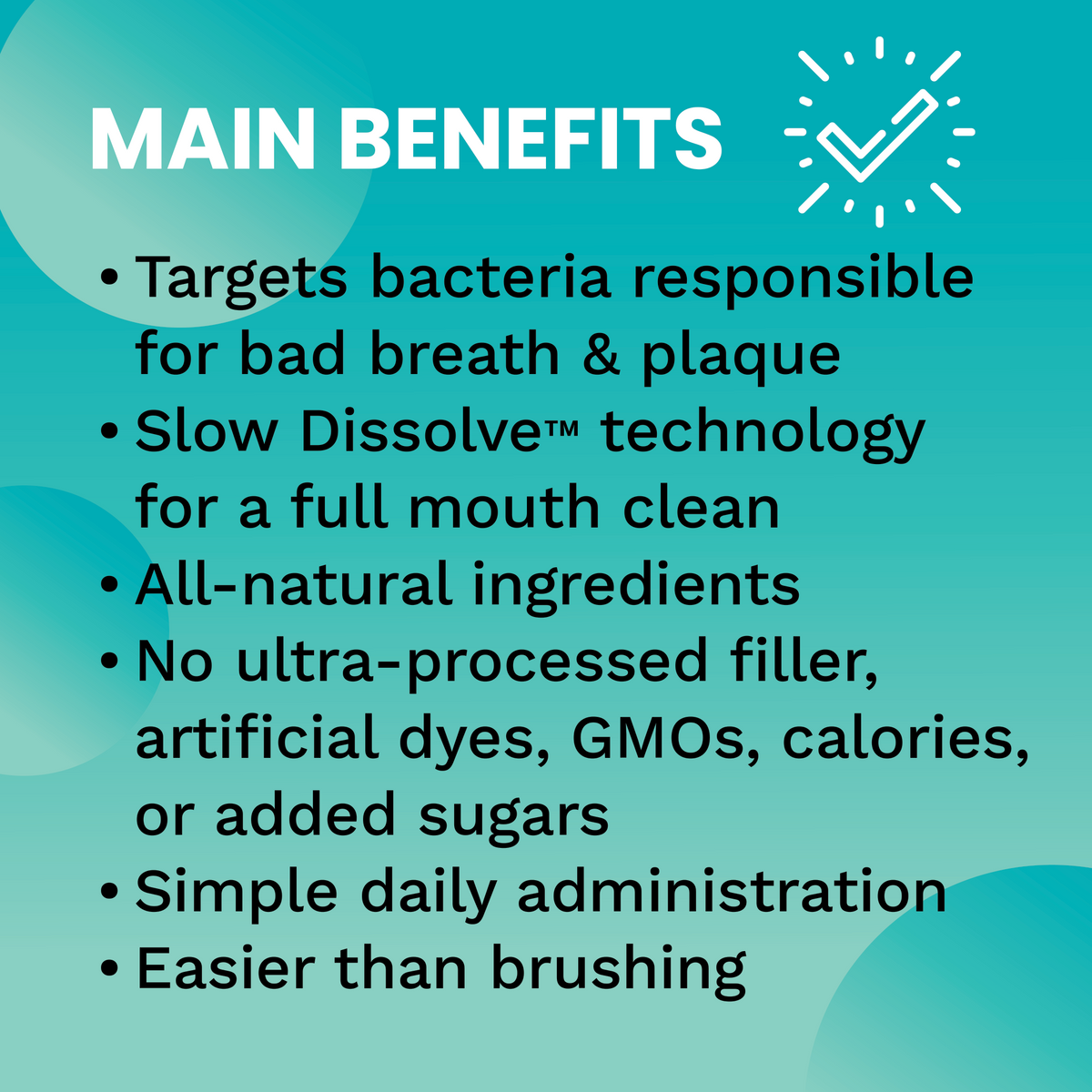 As they dissolve, they disperse active ingredients into a circulating solution that coats teeth and gums throughout the entire oral cavity — including the gumline, between teeth, and back molars.