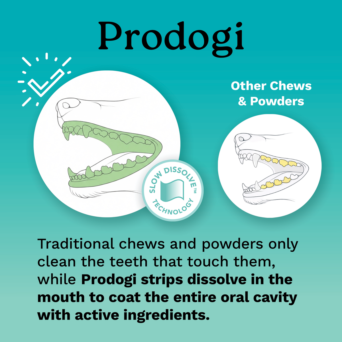 Prodogi Slow Dissolve™ Strips are veterinarian developed to deliver full-mouth coverage.