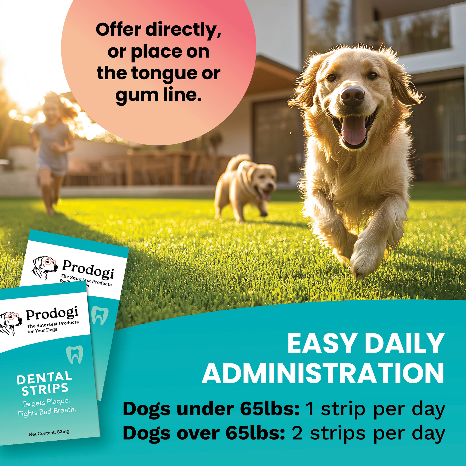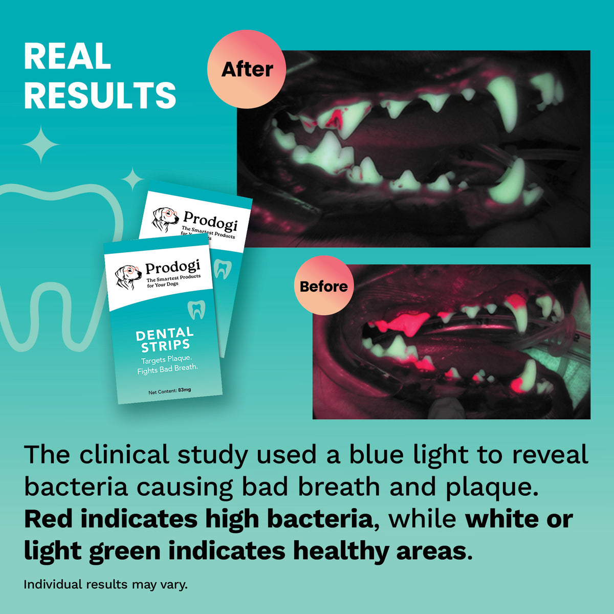 Prodogi strips are like an invisible toothbrush circulating through your dog's mouth, breaking down bacteria that cause plaque & bad breath even in hard-to-brush places.